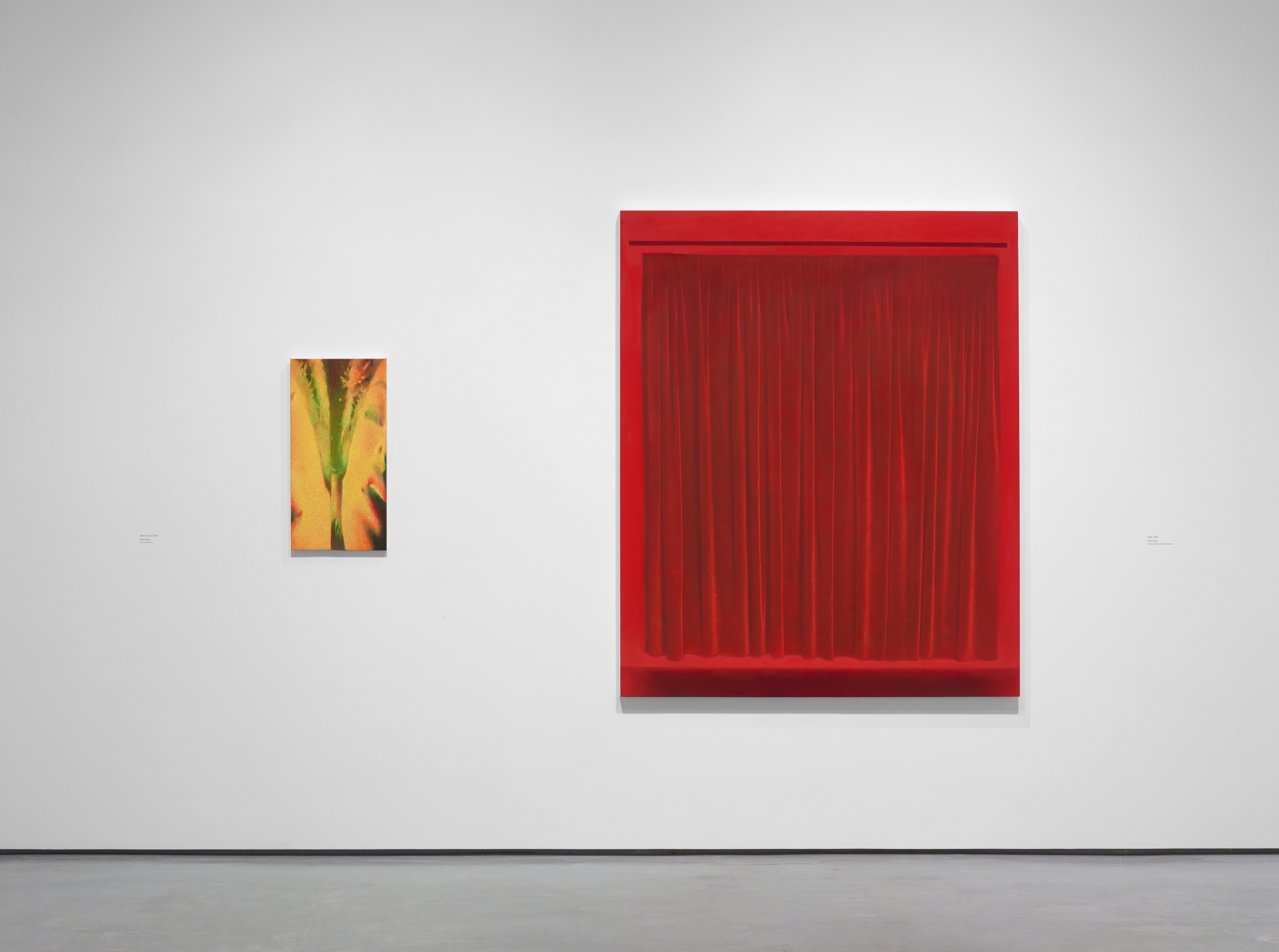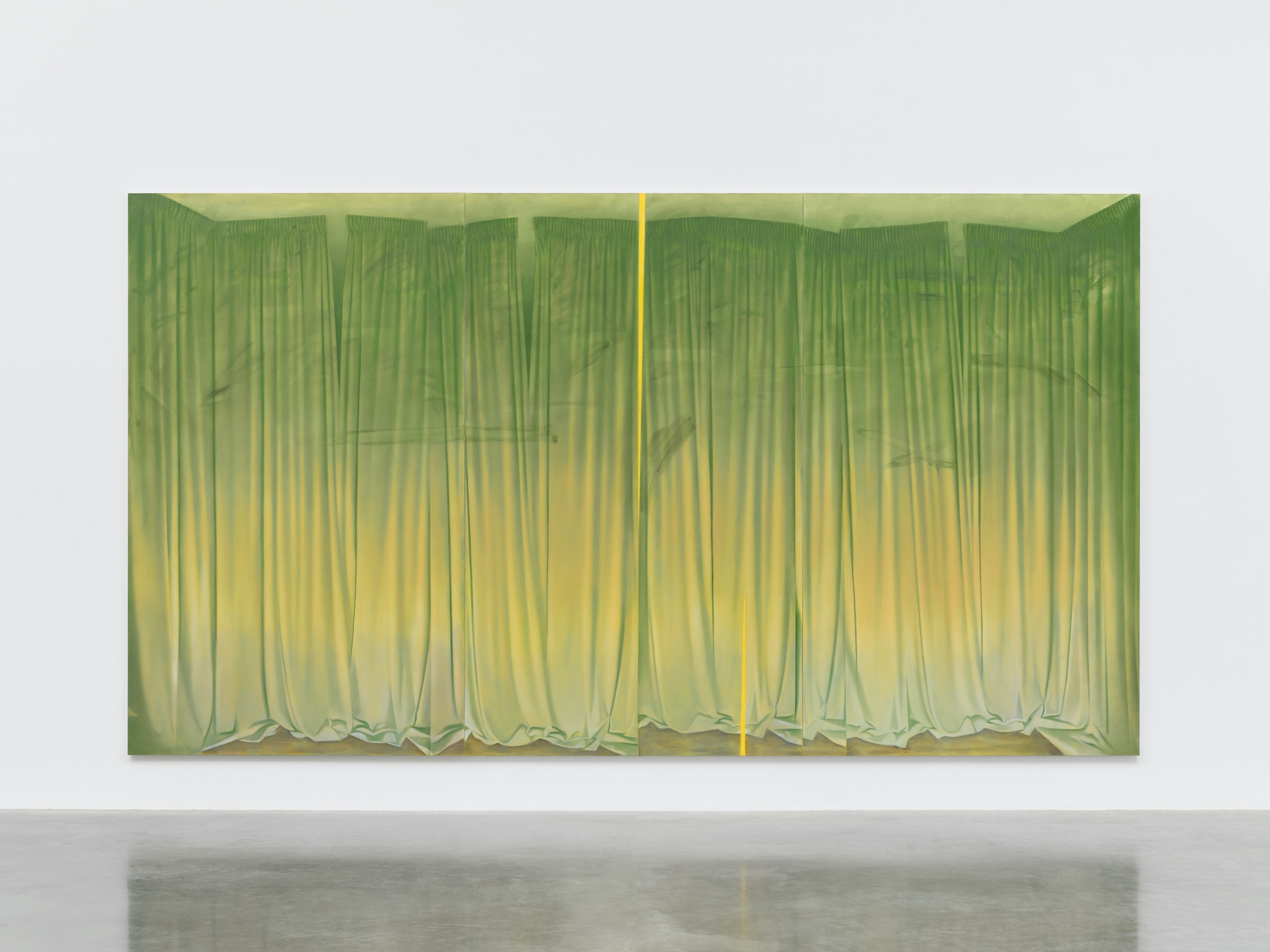Curtains are significant for Giovanelli. Marrying her interests in the theatrical, the Renaissance and the tactile, they have become a kind of calling card for the artist: when an earlier solo show, ‘As If, Almost’, opened at White Cube in 2022, a lime green triptych called Prairie quickly materialised all over Instagram, its bold glow enrapturing both casual fans and habitual critics. Distinctive in their size, and similarly seductive, the drape paintings seem somehow wholly contemporary while alluding to centuries prior. In ‘A Song of Ascents’, Giovanelli’s new show at The Hepworth Wakefield, Scala is among five fresh commissions to depict curtains, a group that also includes the warm red velvet number, ‘Dado’, and ‘Decades’, a sparkly blue piece inspired by Denton Working Men’s Club.